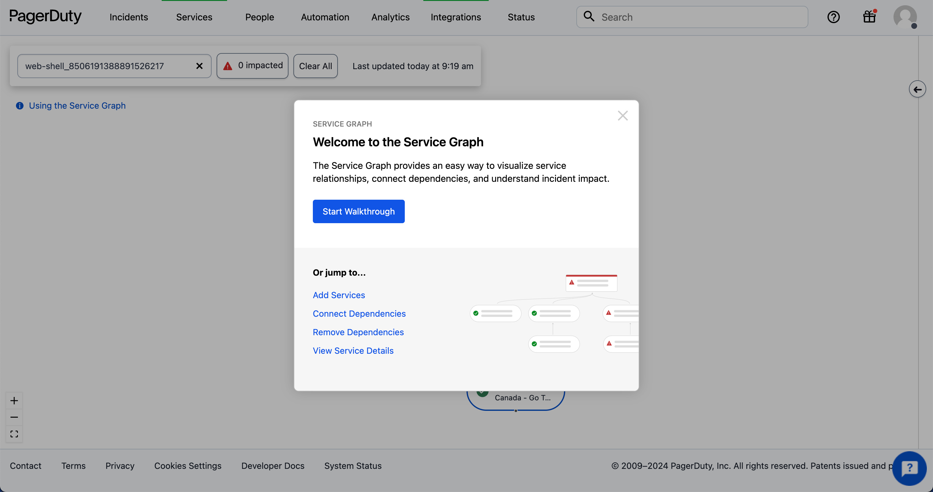 PagerDuty welcomes users to its Service Graph feature with a clear, focused modal that explains the tool’s purpose and offers an immediate action: “Start Walkthrough.” For users who prefer to skip the full tour, alternative quick links like “Add Services” and “Connect Dependencies” are provided underneath. This dual-path welcome supports both first-time users and returning power users, making a dense technical feature feel approachable and navigable.