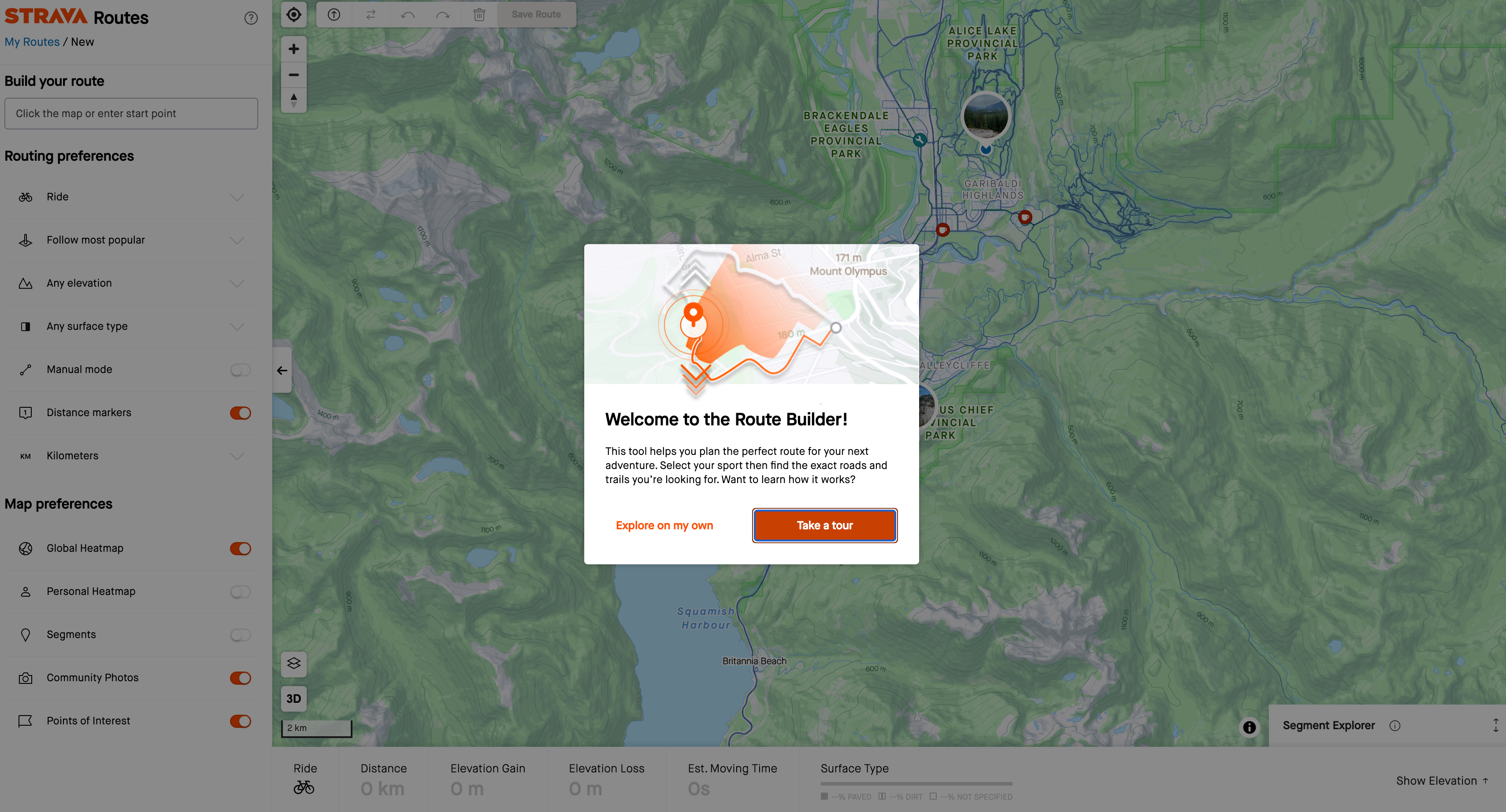 Strava’s Route Builder welcomes users with a clean modal overlay and two clear paths: “Explore on my own” or “Take a tour.” This simple fork respects different learning styles—those who want to dive in versus those who prefer guidance. The bold CTA buttons and map backdrop reinforce the product’s purpose (adventure planning) while immediately offering value and clarity. It’s a great example of giving users agency without overwhelming them.