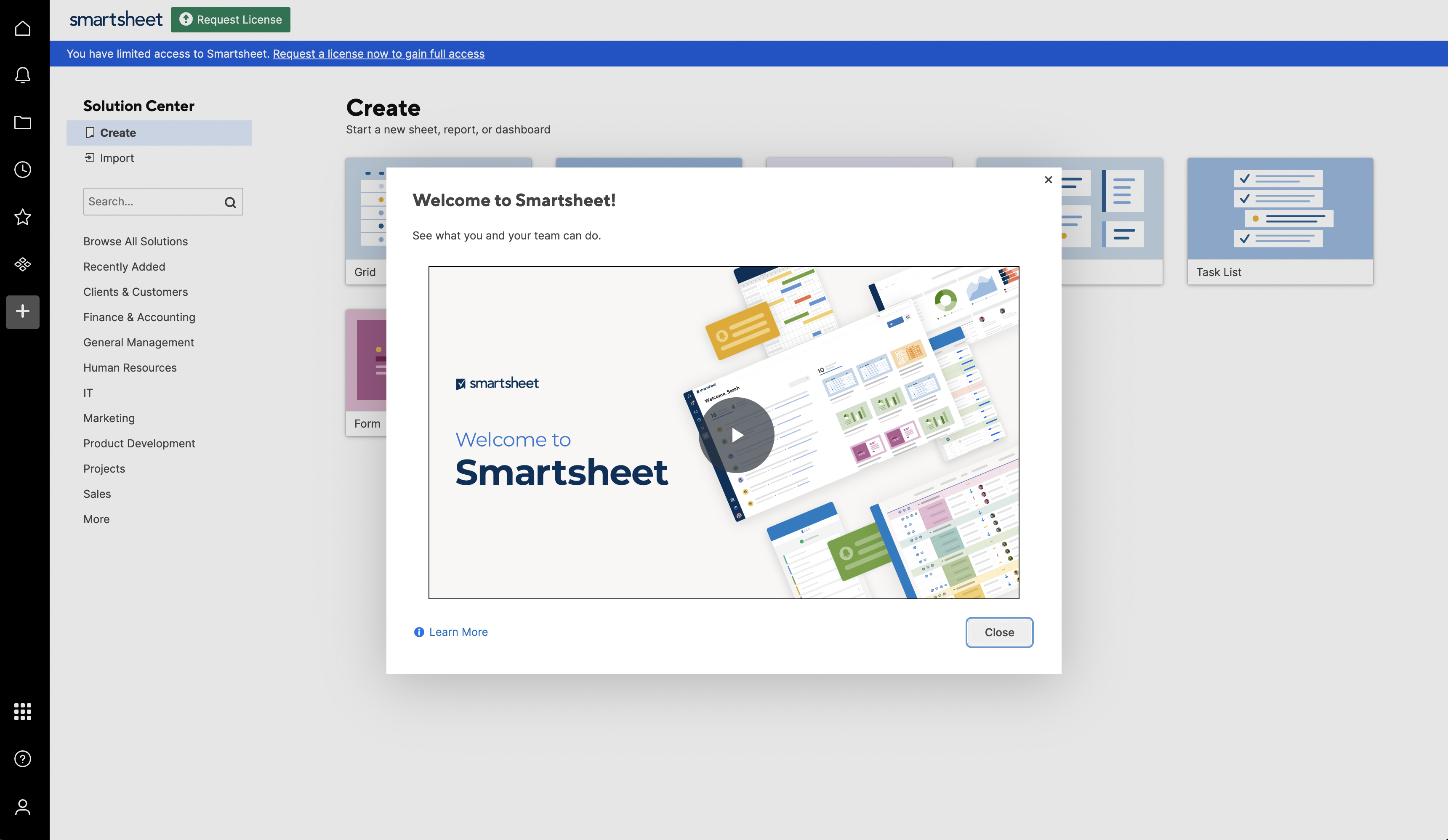 Smartsheet welcomes new users with a bold, branded modal featuring a prominent explainer video. The message is concise — “See what you and your team can do” — and encourages users to engage visually right away. By placing a “Learn More” link and a simple “Close” button, Smartsheet gives users low-pressure entry into the platform’s capabilities while letting the visuals do the heavy lifting.