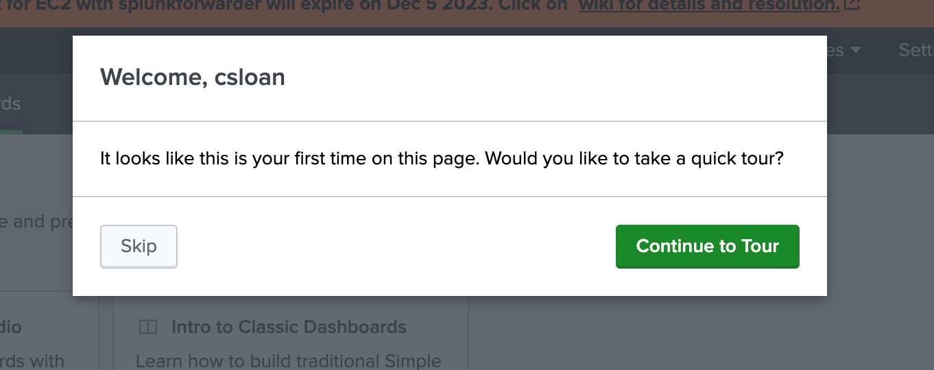 Splunk detects first-time visits and greets users with a straightforward, personalized message: “Welcome, csloan.” It immediately offers a choice — “Skip” or “Continue to Tour” — giving users full control. This welcome message is minimal, contextual, and action-oriented, offering support without disrupting flow. By addressing the user by name and clearly recognizing the novelty of the visit, Splunk creates a helpful, low-friction entry point for learning.