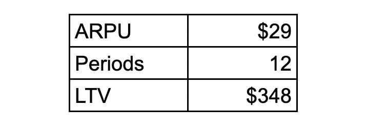 This is an example calculation of LTV for a SaaS business that charges $29/month, with an average customer that sticks around for 12 months. Int his simple example, the SaaS business' LTV is $348.
