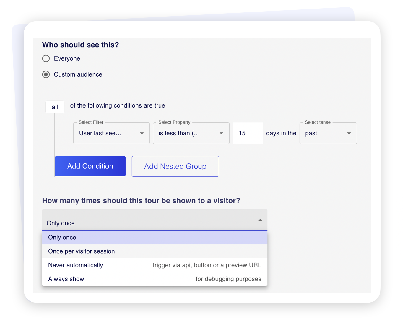 Create tours, modals, tooltips, announcements, and surveys. Target any audience segment within your product or website.