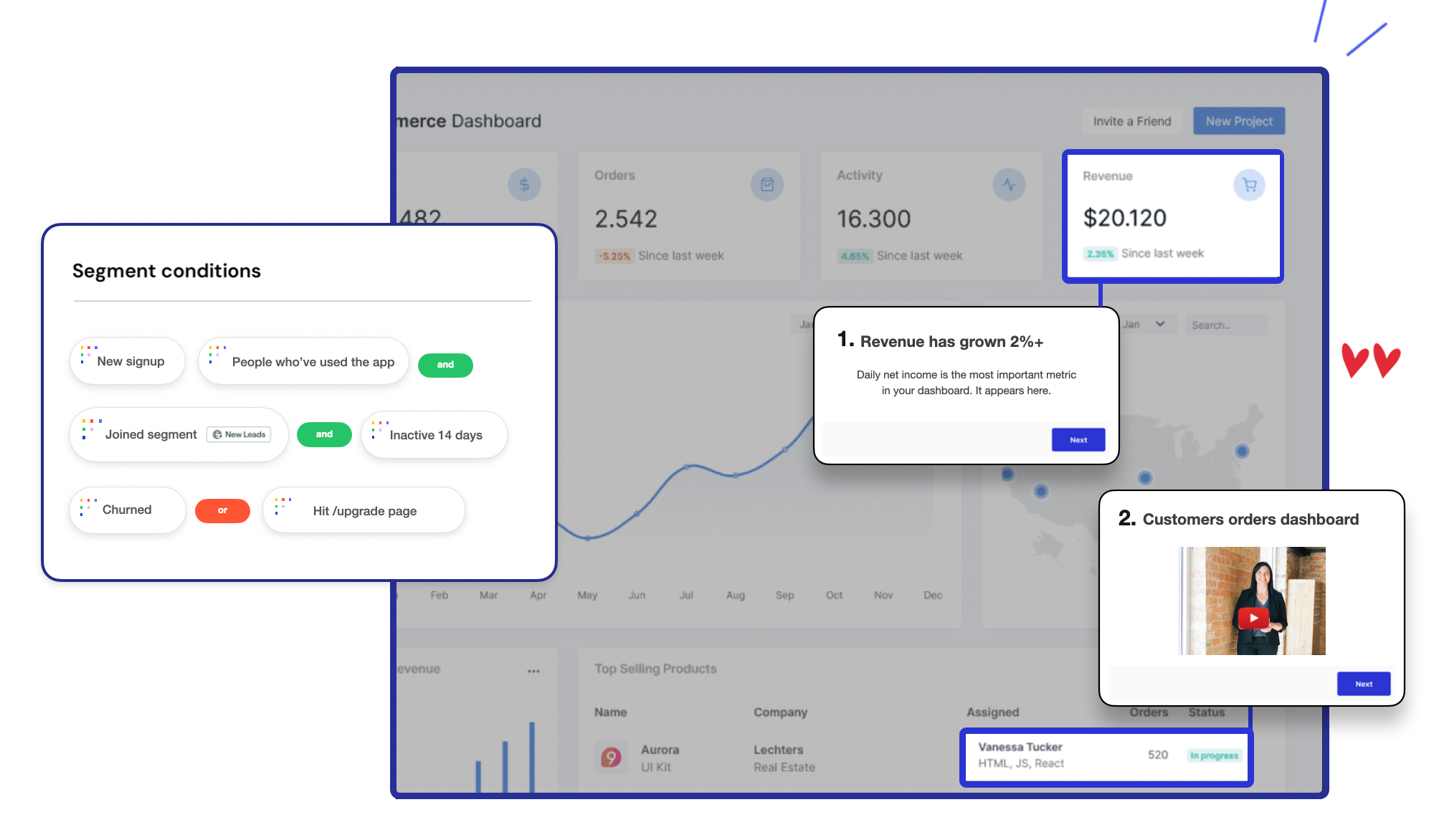 Drop one line of code, and make beautiful drag-and-drop product tours, announcements, tooltips, surveys and more. Trigger tours based on user activity, use custom events, and hundreds of out-of-the-box segmentation options.