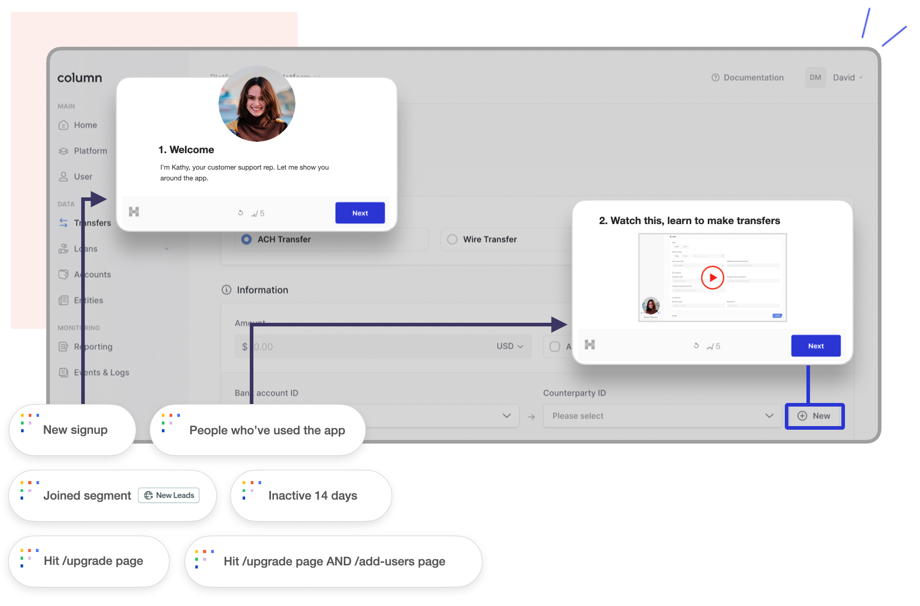 Target any audience segment within your product or website. Create tours, modals, tooltips, announcements, and surveys in two minutes.